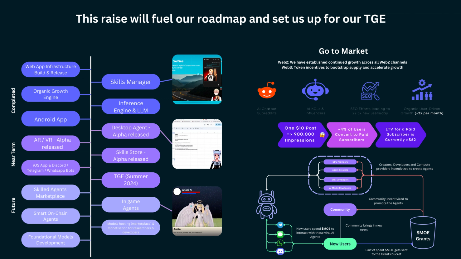 Moemate began as a Web2 project, but it is now moving towards Web3 with the aim of fully decentralising its platform. They are shifting from user-owned agents to on-chain agents that can operate independently and handle transactions. Moemate is also creating a utility token to be at the heart of their ecosystem as they move to a decentralised marketplace model. This strategy helps to increase supply, speed up growth, and reward everyone involved.