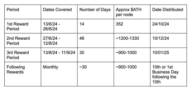 At the time of Aethir Node Sale in our app, SwissBorg planned to distribute $ATH Rewards from nodes quarterly, approximately one month after each financial quarter, because there were many unknowns about how the rewards would be distributed and of any potential penalties.