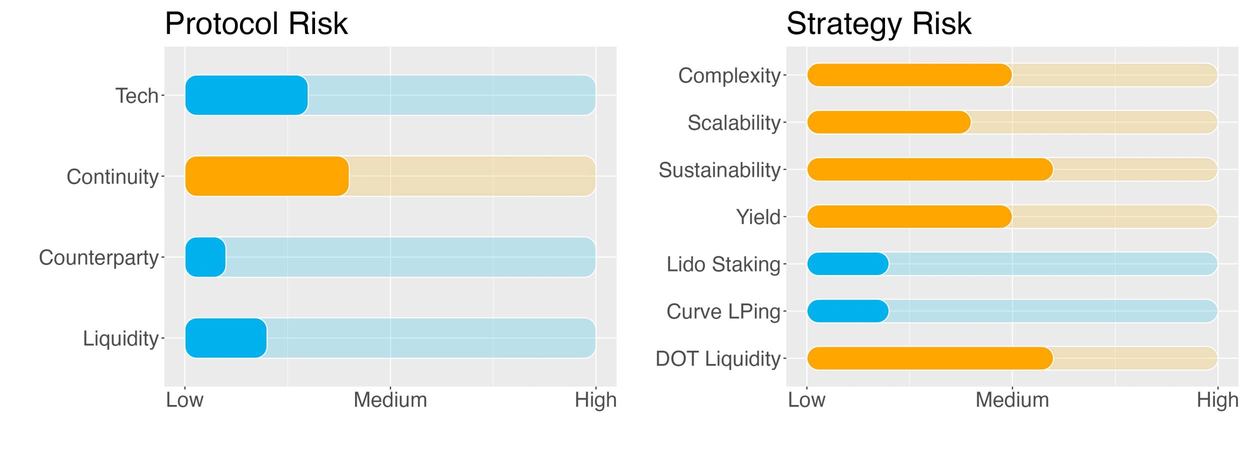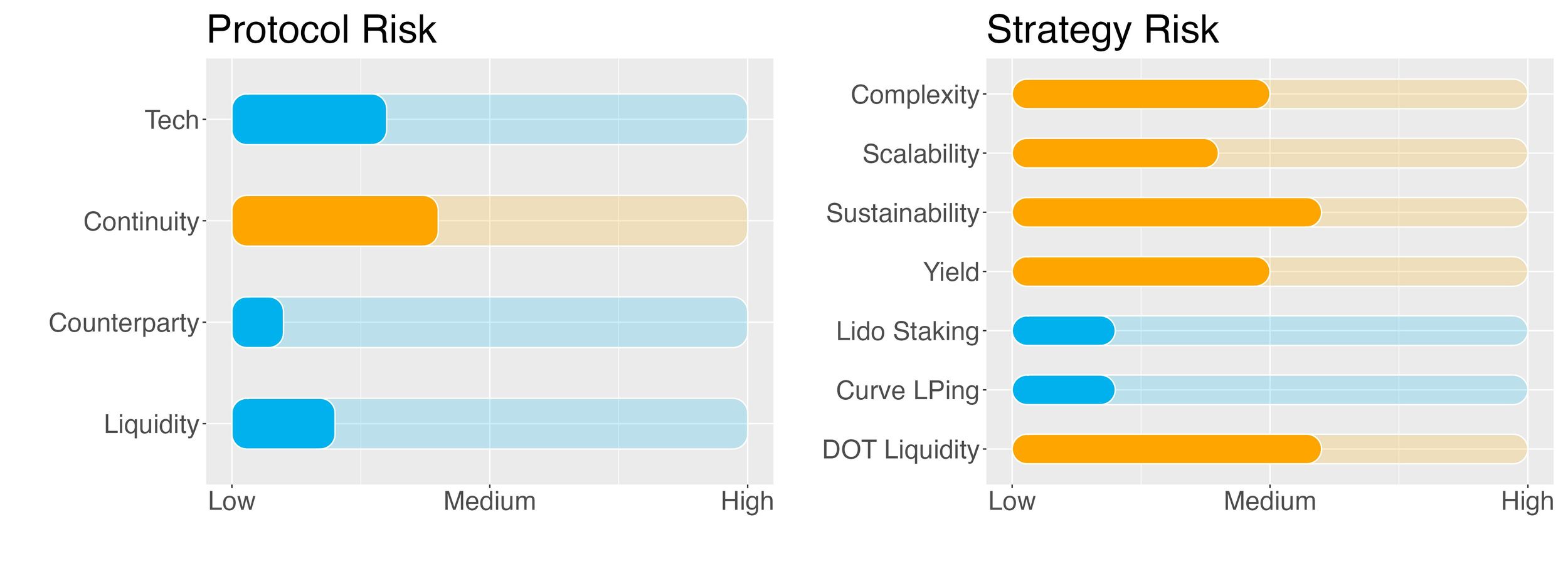The strategy employs one chain (Moonbeam), 3 protocols (Beefy, which leverages on Lido and Curve), and two tokens (xcDOT and stDOT). Because of this the complexity risk of the strategy is deemed medium.