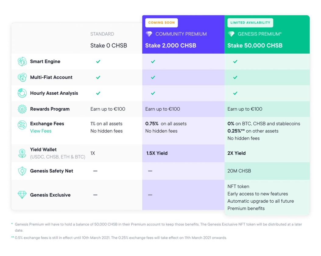 The Genesis Premium account is our way of saying thank you to those who have supported us by staking CHSB in the early days of our app. Because of this, all existing Premium users will be automatically upgraded to Genesis Premium, and will get the benefit of lower fees from 11th March, 2021!