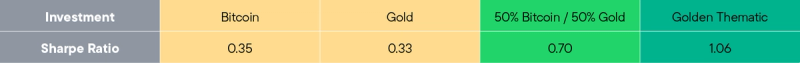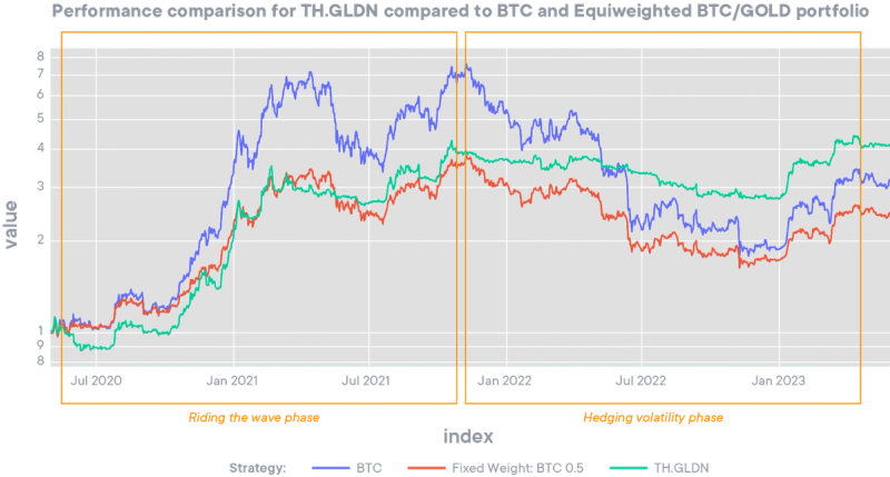 This backetest showcases the dynamic capacity of the Golden Crypto Bundle to adapt to different market regimes. During bullish Bitcoin price movements the Golden Crypto Bundle is able to “ride the wave” and present a strong correlation to Bitcoin. As the market turns and shifts downwards the Golden Crypto Bundle breaks that corollary, significantly over performing Bitcoin with hedging itself in Gold to minimise drawdowns.