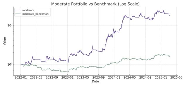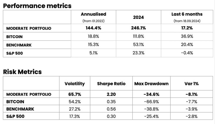 To get started with this new product, you’ll be asked to answer a set of questions that will help us at SwissBorg better understand your unique risk-reward profile and investment goals. Based on this information, you’ll be matched with one of three main portfolio options: Moderate, Growth, or Aggressive (not available). Each of those portfolios is designed for a specific risk profile. The portfolio is designed to exceed the performance of its benchmark while maintaining a comparable level of risk. This means that while aiming for higher returns, the portfolio’s risk exposure remains aligned with the benchmark's, balancing growth potential with controlled risk management.