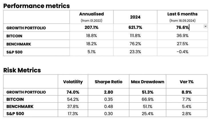 This portfolio targets high returns with significant exposure to the crypto market. As a mid-risk option, it is ideal for investors with a good risk tolerance who seek capital appreciation and can withstand increased volatility.