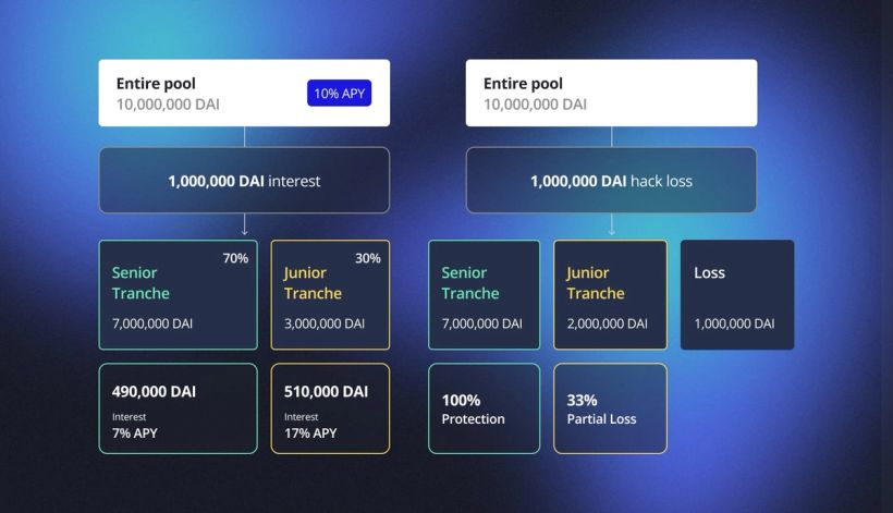 So if any of these two events were to happen, the losses would first be absorbed by Junior tranche holders. The risk/return trade-off is here perfectly reflected. The larger the coverage of Junior tranche (i.e. assets deposited into Junior compared to Senior), the lower the APY differential between tranches, but also the lower the risk for a single Junior tranche investor in case of loss since a large pool would better absorb it. On the other hand, small coverage would imply very high APY with Junior tranche holders, but also the risk that a loss wipes out the entire pool (and eventually attacks also the Senior tranche holders).