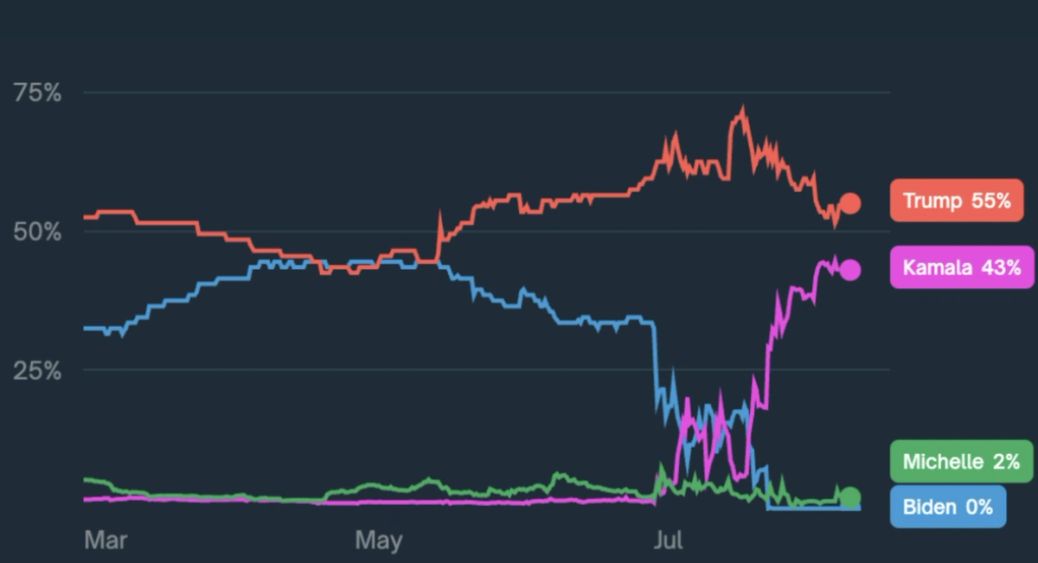 On the political front in the United States, the race between Kamala Harris and Donald Trump is tightening. According to Polymarket odds, Harris is closing in on Trump’s lead, a development that has caught the attention of the markets. The market had already started to price in a Trump victory, which many believed would lead to certain economic policies favourable to risk assets. However, with Harris gaining ground, there’s increased uncertainty about the future political landscape. This political uncertainty is contributing to market volatility, as investors grapple with the potential policy shifts that could come with either outcome. The crypto market, sensitive to such uncertainty, is likely to remain volatile as the U.S. presidential race unfolds.