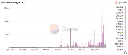 Rainbow Bridge, a trustless bridge between Near, Ethereum, and Aurora (EVM compatible Layer 2 built on top of Near Protocol), saw spikes in USD inflows to the Near and Aurora chains, with over $2 billion worth of assets bridged to date.