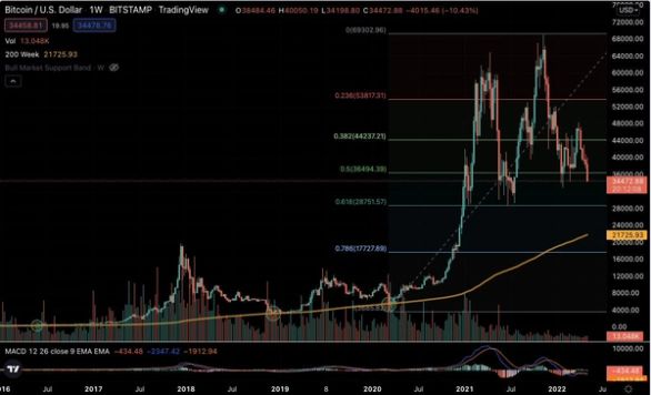 After bull-run peaks, Bitcoin has experienced steep corrections to the 0.78 and 0.88 Fibonacci retracement levels before starting another long-term uptrend. This means that the current retracement at the 0.5 levels (~$36,000) leaves room on the downside for much steeper corrections, especially to the 0.61 levels (~$29,000). Another indicator on the weekly chart that has been a long-tested bear market bottom indicator for Bitcoin is the 200-week simple moving average (orange line). Bear market bottoms in 2016, 2018, and 2020 used this line as support before starting another bullish market cycle. Again, this line sitting at the ~$21,700 levels shows room for further downside in the medium-long term.