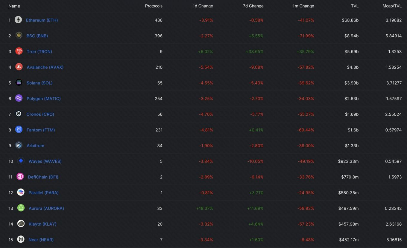 Since Terra vanished from the DeFi space, the sphere has seen some significant TVL dominance repositioning. In the last month, Tron has been the only blockchain to grow in TVL. In fact, it is the only blockchain in the top 20 by TVL that has grown in TVL since the start of 2022, with other networks falling anywhere between 30% and 70%