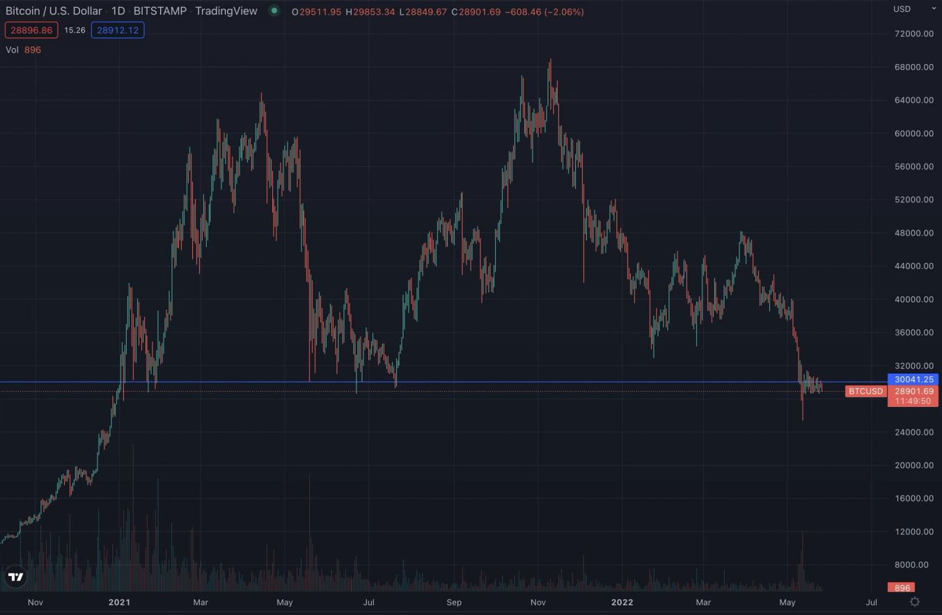 The crucial technical and psychological support level is at 30k, and with the influx of negative news as well as the overall hit to the crypto market caused by the downfall of Luna and UST, the short-term outlook is not extremely optimistic.