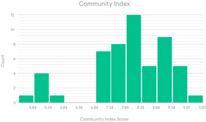 Each of these metrics represents a different element of our ecosystem, and the subscores combine to create a Community Index score between 0-10.