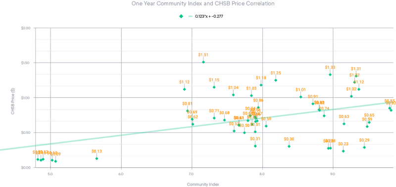 We can see that there is moderate correlation between the Community Index and the price performance of CHSB over the period of a year. In the chart below, we can see that in the majority of cases, when the price of CHSB is strong, the Community Index score is above 7.0.