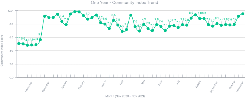 However, since December the Community Index has never fallen below 6.9, which is a very healthy score. The average score, as well as the most common score, is 7.9, while the highest Community Index score was 9.8 - achieved on February 8th and February 15th.
