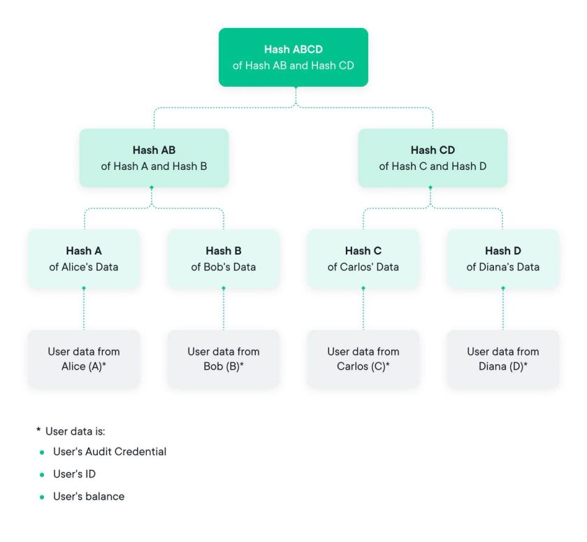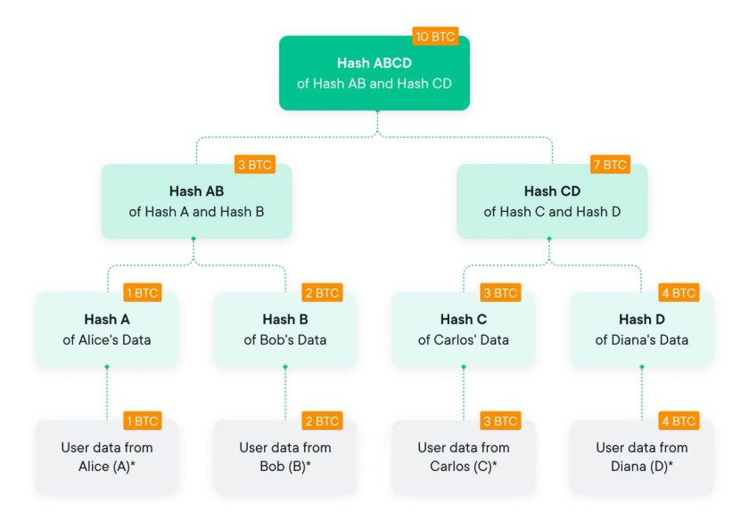 This way, the root node balance becomes the sum of all user liabilities. This data structure is called a ‘summation Merkle Tree’ as seen in the diagram below.