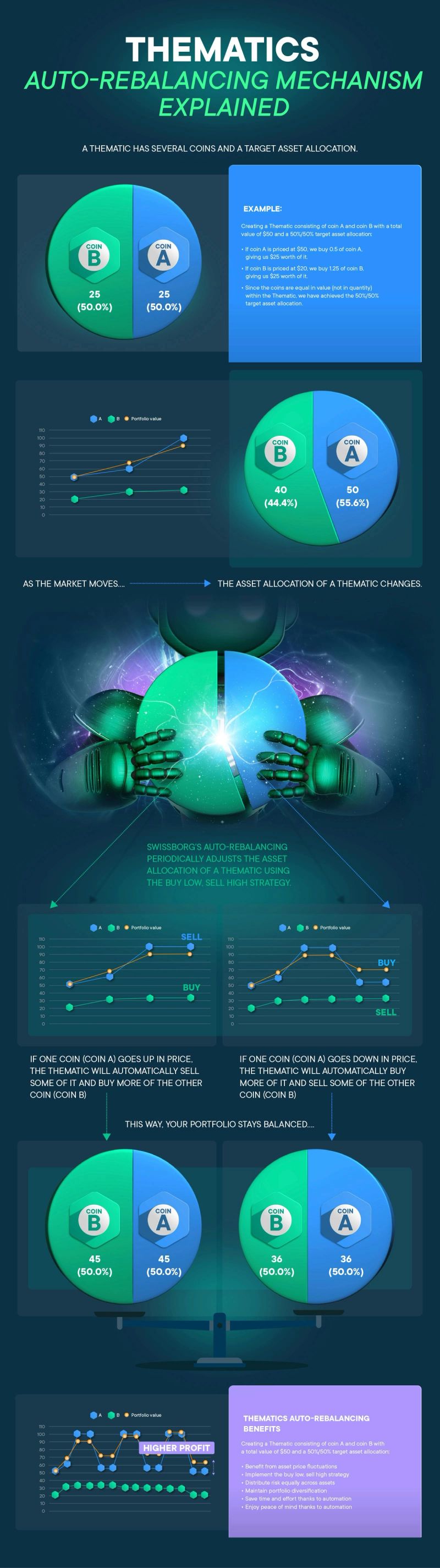 - As those cryptos’ prices change over time, their weighting in the thematic will change. To maintain the original ratios, or portions, the SwissBorg app will automatically buy and sell those assets.