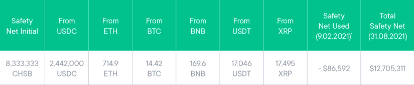 SwissBorg established a USD1 million Safety Net Program in CHSB (8,333,333 CHSB) to protect against Smart Contract risk, and we have historically put the equivalent of 25% of max yield earnings into that program to ensure it grew alongside our community’s investments.
