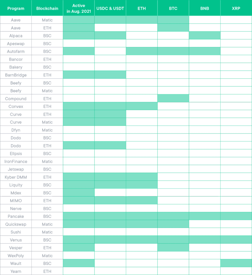 Safety remains a concern in DeFi, with the largest exploit in DeFi history taking place in August. We had previously identified cross-chain platforms as an emerging trend, and due to the novelty of this type of platform, there is an increased security risk. PolyNetwork is one such cross-chain platform and suffered a loss of $600+ million but was returned by the ‘white-hat’ hacker soon after, though the non-malicious intention of the exploiter was not initially apparent. Several other exploits also took place in August, with two of them netting upwards of $18 million. It is easy to see that the longer a user participates in DeFi platforms outside of the very large household names, the more likely it is they will incur a loss due to exploits.