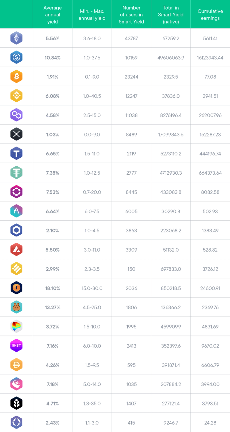For the sake of transparency towards our community, on a monthly basis, we aggregate our data to give you a report on the key figures related to SwissBorg’s Smart Yield wallets.