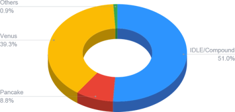 The investment allocation changed frequently over the course of the month, with yield variability across platforms and the volatility of the rewards driving our optimiser to rebalance multiple times. The Smart Yield program is currently concentrated in platforms with little exposure to DAI, since the volatility of the ETH token has led to risk management concern with regards to the DAI systematic risk.