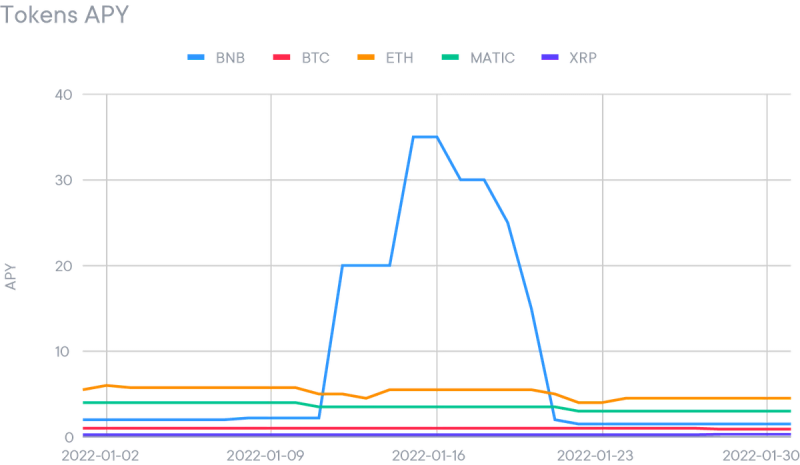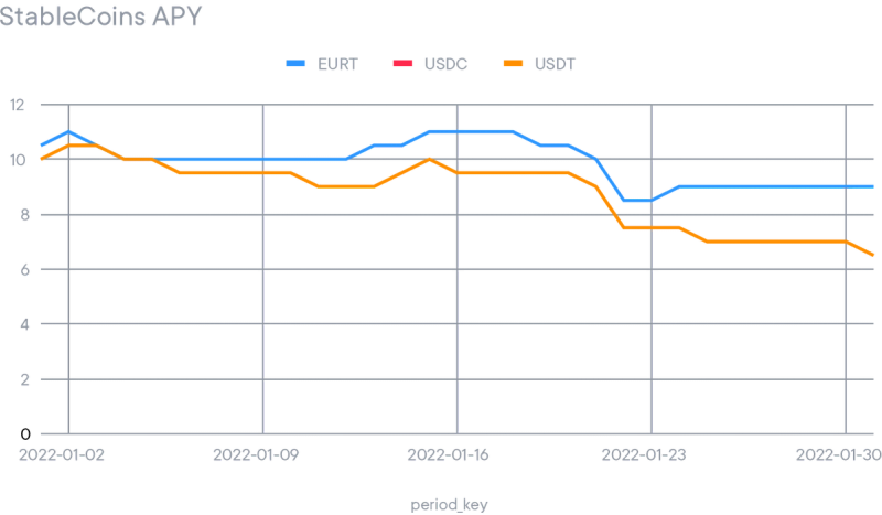 The following table summarises the wallet actions in January. It was particularly volatile with the premise of a bear market, inducing fear in traders’ behaviour. This was reflected by a reduction of the amount allocated to the Smart Yield wallets across almost all currencies, except Matic, USDT and EURT. EURT saw a lot of the traction coming from the reduction in APY from the USDC and USDT stable coins, which ended up making EURT the top yielding asset. Matic saw strong traction with more than 10% new users being the second most adopted yield wallet this month in proportion.