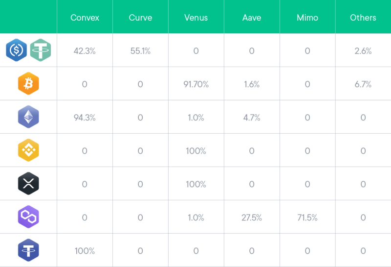 The allocation is very similar to the one in December, with Convex and Curve representing almost all the allocation of stablecoins. BTC saw a slight change of allocation with a new strategy coming on Aave.