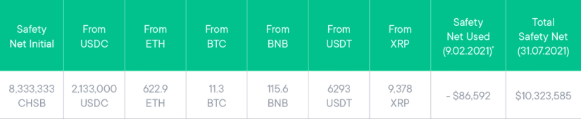 SwissBorg has also established a USD1 million Safety Net Program in CHSB (8,333,333 CHSB) to protect against Smart Contract risk, and we put the equivalent of 25% of max yield earnings into that program to ensure it grows alongside our community’s investments.