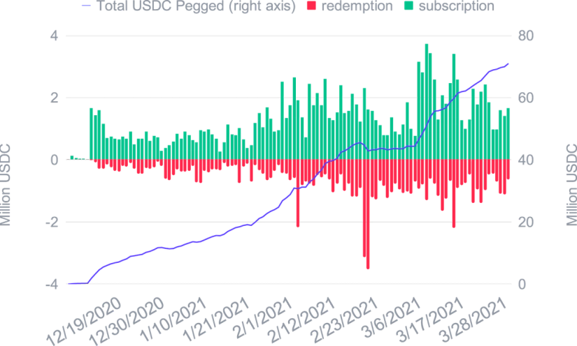 After a slowdown in growth at the end of February and a major redemption that was seen when Bitcoin had significant bullish momentum, the growth of USDC Smart Yield wallets has resumed. Indeed, since Bitcoin has stabilised and is struggling to break the $60,000 mark, users have diversified their portfolios with the Smart Yield on USDC, which allows positive performance with reduced volatility.