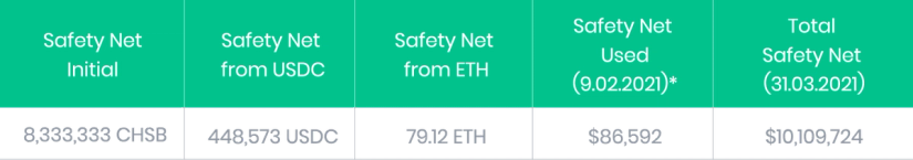 SwissBorg has also established a USD1 million Safety Net Program in CHSB (8,333,333 CHSB) to protect against Smart Contract risk, and we put the equivalent of 25% of max yield earnings into that program to ensure it grows alongside our community’s investments.