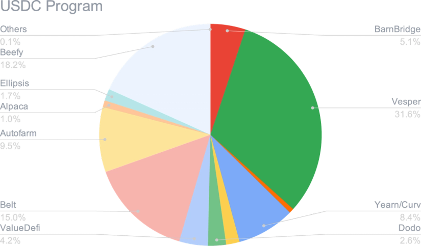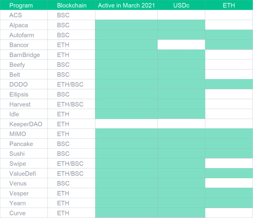 19 different applications were used in March for maximum diversification - nine for the ETH wallets and 18 for USDC. Eight applications were common to both.