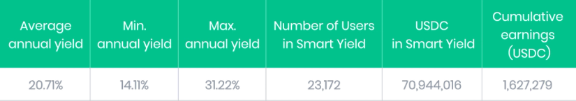 The yield offered for USDC continues to average more than 20% p.a. for Premium users. In the past three and a half months, users have gained more than 1.6 million USDC through their Smart Yield wallets.