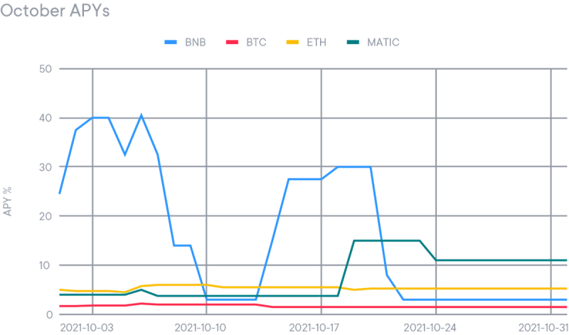 Adoption also followed the trends in the yield rate. Matic and BNB saw a strong increase during the month, which led to almost a 2x of the amount pledged in the Smart Yield for those two currencies. It came mostly from high net worth individuals chasing the best yields. The other pots stayed impressively stable during October, even when new all-time highs were reached.
