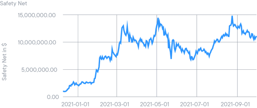 The Safety Net is a common pot for all Smart Yield wallets and therefore benefits from the yield of all wallets. With the compound growth of the other Smart Yield wallets and the recovery of the market, the Safety Net is above US 10 million at the time of writing, with it’s value fluctuating along with the underlyings prices.