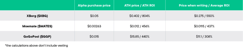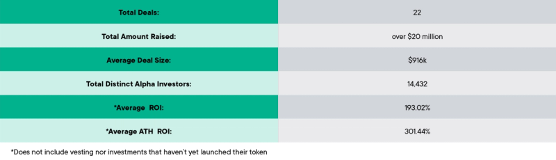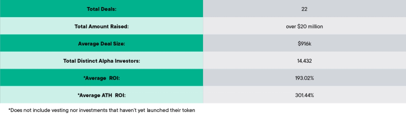 The purpose of Alpha Deals is to give our users the privilege to invest in projects vetted by a team of experts. In our opinion, ideally, users would invest a comfortable amount into many projects and diversify their portfolio. Let’s see what would happen if the user invested $100 into every Alpha token deal.