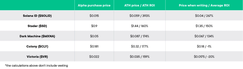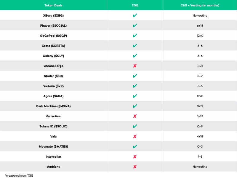 Besides the ones mentioned above there are also 5 other projects with their token live and 5 more in the pre-TGE phase. The former include Solana ID, Stader, Dark Machine Colony and Victoria VR, while the latter are ChronoForge, Galactica, Vala, Intercellar & Ambient.