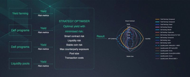 The strategy optimiser monitors and rates all available investment opportunities - DeFi programs, CeFi programs and liquidity pools - based on their risk and expected returns.