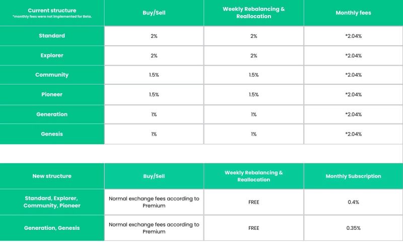 Fees are a delicate subject and there’s a constant struggle between necessity and pleasing the app users. That is why we are incredibly pleased to announce that we are saying "goodbye" to Rebalancing Fees, "au revoir" to Reallocation Fees, and "chömmed guet hei" to elevated exchange Fees. All that will be left is a recurring subscription fee set as low as 0,35%/month for our upper Premium users.