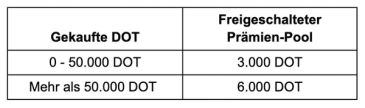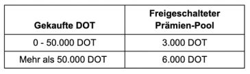 Der Prämienpool wird auf Grundlage der Community-Ziele freigeschaltet. Je mehr DOT-Token gekauft werden, desto mehr Belohnungen werden freigeschaltet!