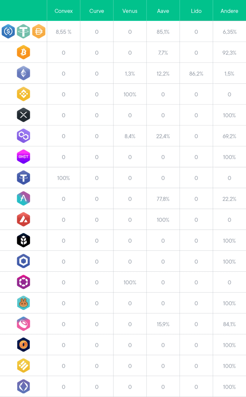 Die Smart Yield Wallets blieben relativ stabil. Blockchain-native Token gewinnen wieder etwas an Aufmerksamkeit. Das liegt daran, dass sie die stabilste Quelle für Erträge sind, die am häufigsten verwendeten Token in ihren jeweiligen Blockchains sind und weniger riskante Optionen darstellen. Der einzige Token, der diesem Trend nicht folgt, ist ETH. Dies liegt vor allem daran, dass sich die Angst vor möglichen Liquiditätsproblemen der ETH Yield Wallets verbreitet hat. Wir möchten daran erinnern, dass diese Probleme auch andere Branchenteilnehmer aufgrund mangelnder Vorsicht, übertriebener Gier und Leverage-Positionen betroffen haben. Der Smart Yield Optimizer war stets auf ein sehr gutes Risikomanagement eingestellt und steht in keiner Weise in Verbindung mit den Akteuren, die versagt haben.