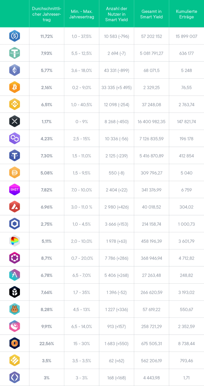 Die Smart Yield-Wallet vereinfacht und optimiert jeden Tag den Ertrag deiner Krypto-Assets. Ziel ist es, den höchsten Ertrag bei geringstem Risiko zu erzielen sowie einige der besten Ertragsbedingungen zu bieten, die auf dem Markt erhältlich sind.