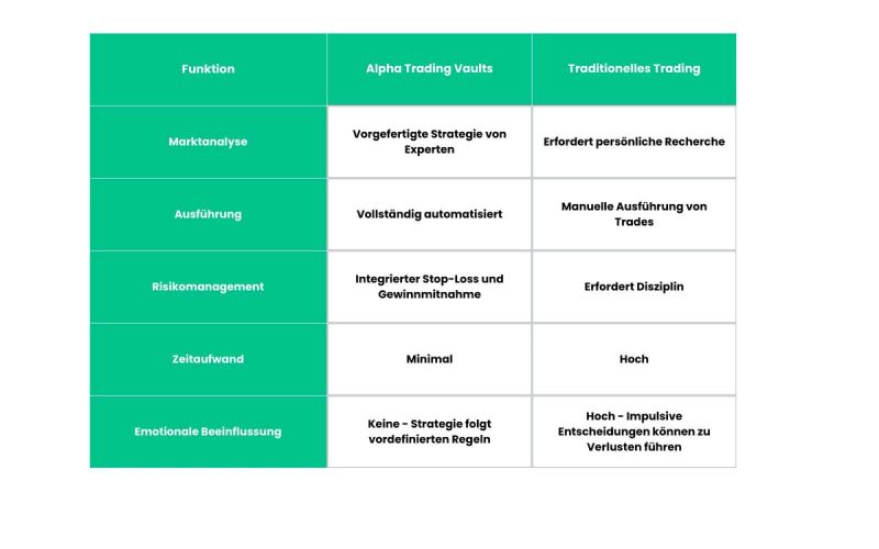 Im Gegensatz zum traditionellen Trading, bei dem der Anleger den Markt beobachten, Trends erkennen und sofort reagieren muss, bietet Alpha Trading Vaults einen Ansatz, der die Komplexität reduziert und emotionale Entscheidungen vermeidet.