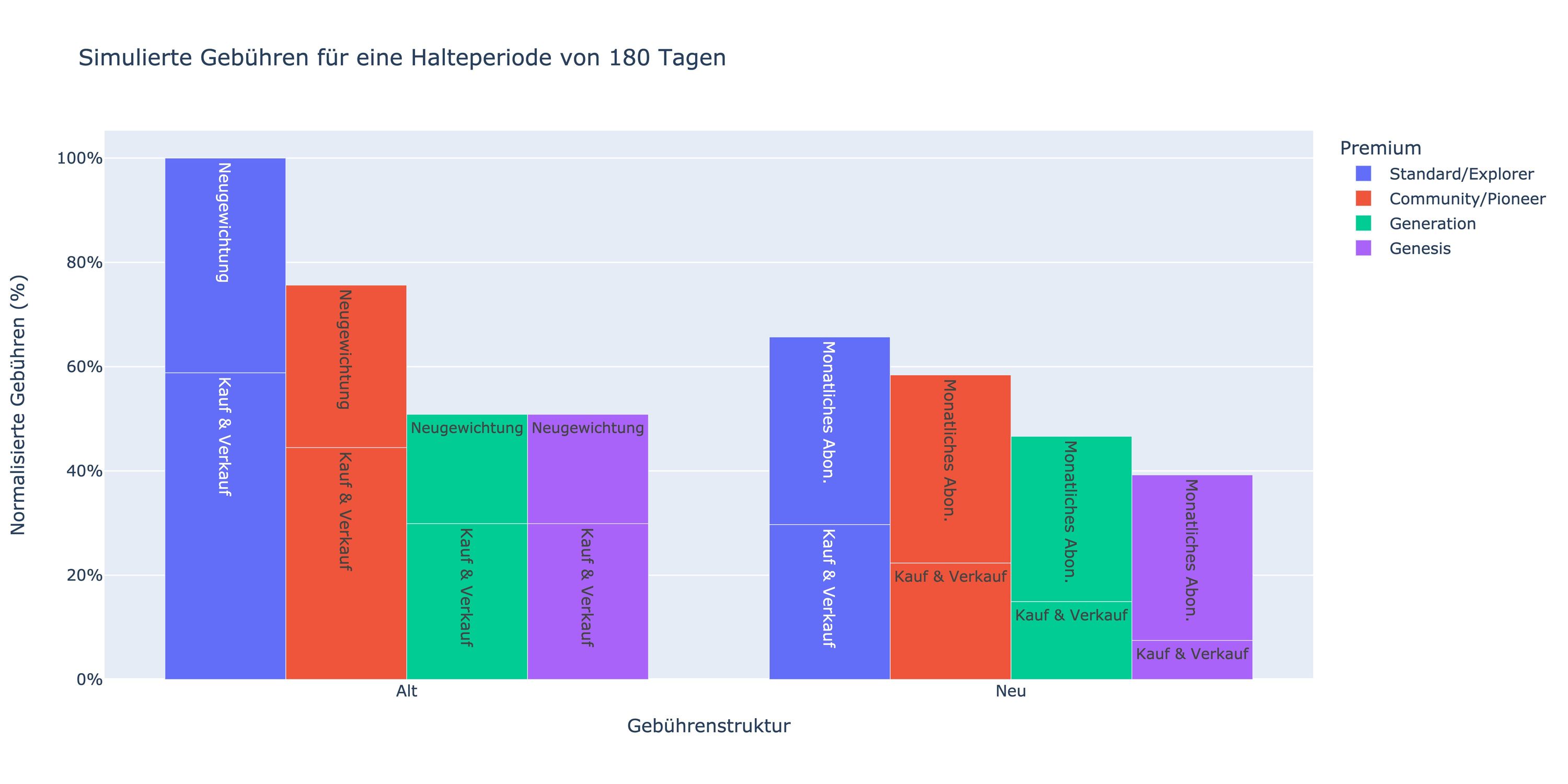 Die Simulation der Gebühren berücksichtigt das Holding von Thematics für 180 Tage mit einem gleitenden 3-Tage-Fenster, beginnend am 1.11.2020, um unterschiedliche Marktregimes zu berücksichtigen. Wir stellen die Gebühren normalisiert in Bezug auf die Standardgebühren der alten Struktur dar. Die obige Grafik zeigt, dass die neue Gebührenstruktur für alle Prämienstufen vorteilhafter ist.