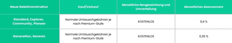 Wir sagen “Auf Wiedersehen” zu Neugewichtungsgebühren, "Au revoir" zu Umverteilungsgebühren und " Chömmed guet hei" zu erhöhten Umtauschgebühren. Übrig bleibt lediglich ein monatliches Abo ab 0,35 % für unsere Genesis & Generation Premium-Nutzer.