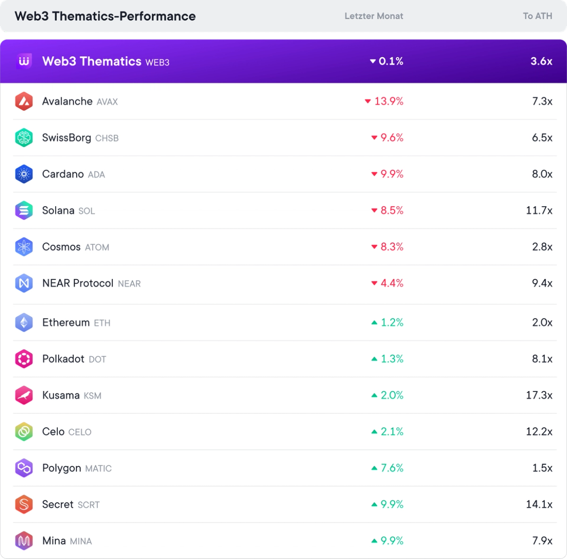 Werfen wir einen Blick auf die Performance des Web3-Thematics im Vergleich zum Besitz der einzelnen Token, die das Bündel bilden. Die Spalte "Letzter Monat" stellt die Wertentwicklung im Januar dar, und "Zum ATH" ist der Gewinn, den wir alle erzielen würden, wenn die Vermögenswerte wieder zu ihrem Höchstpreis ansteigen würden.