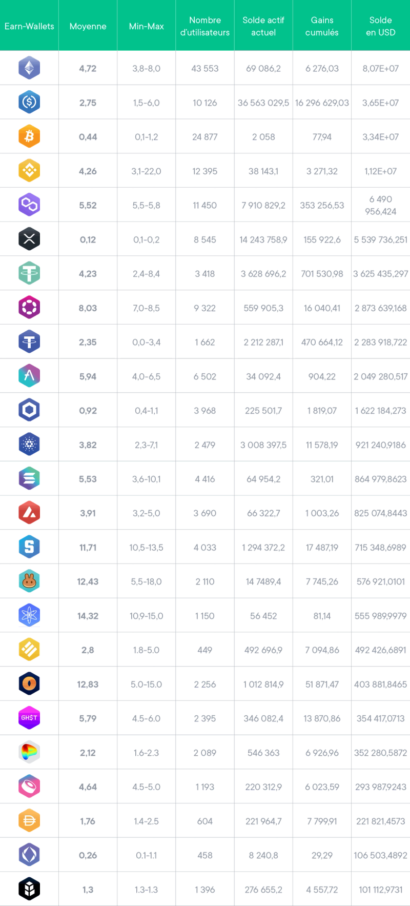 Le tableau suivant a été modifié pour refléter l'évolution du yield des 3 derniers mois (septembre, octobre et novembre). Le nombre d'utilisateurs et le montant total dans le programme Earn sont calculés à la fin de la période et incluent tous les yield wallets (Core et Satellite).