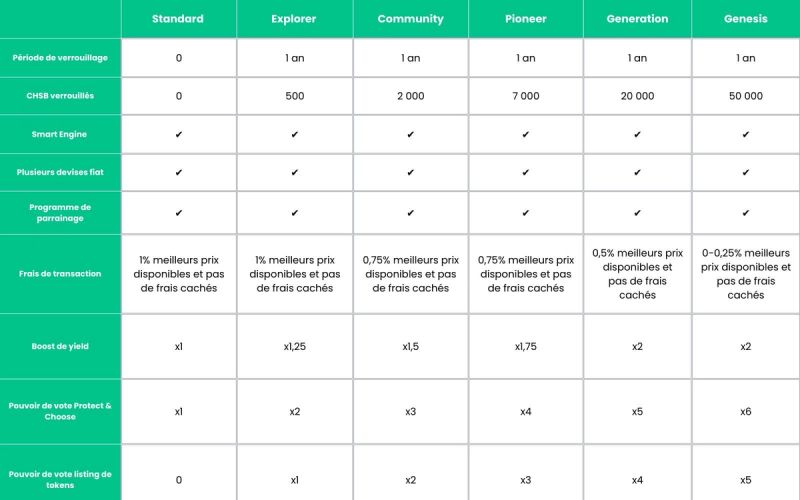 Nous avons également décidé d’introduire le niveau Pioneer, destiné à nos membres qui se retrouvent coincés entre le Community et le Generation. En verrouillant 7 000 CHSB sur 12 mois, vous aurez accès aux avantages du Pioneer :