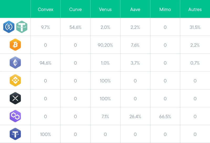 Le changement principal d’allocation s’est produit pour les stablecoins dont le yield sur Convex a baissé. Le taux de yield des stablecoins a baissé sur Ethereum alors qu’il est resté élevé sur la version Avalanche de Curve.