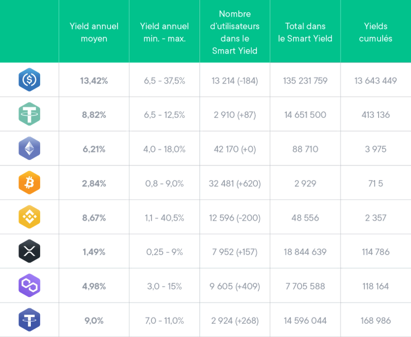 Dans un souci de transparence envers notre communauté, nous recueillons mensuellement nos données pour vous donner un rapport sur les chiffres clés liés aux portefeuilles Smart Yield de SwissBorg.