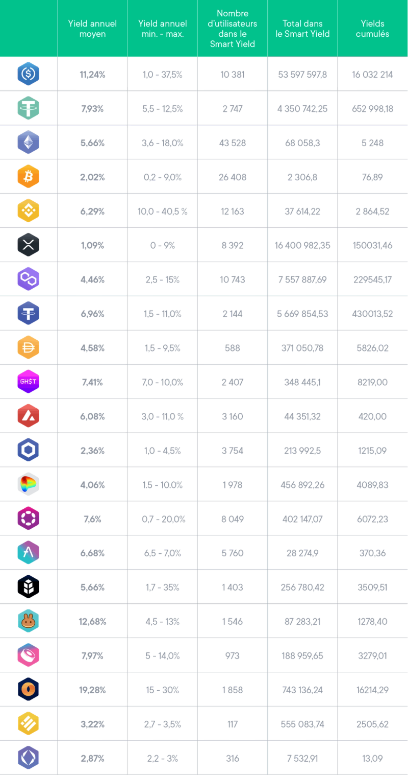 Dans un souci de transparence envers notre communauté, nous recueillons mensuellement nos données pour vous donner un rapport sur les chiffres clés liés aux portefeuilles Smart Yield de SwissBorg.