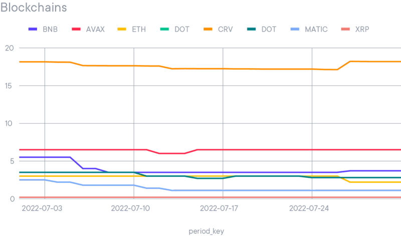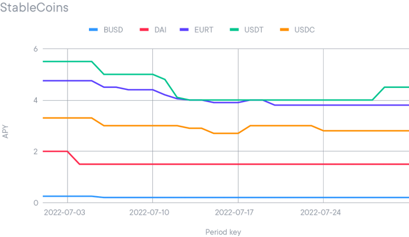 Les récompenses sont restées constantes au cours du mois de juillet. Les prix ont connu de belles fluctuations, mais la TVL des plateformes et leurs récompenses sont restées constantes. Les tokens natifs de blockchain ont connu une certaine traction car ils restent la source de yield la plus stable, les tokens les plus utilisés sur leurs blockchains respectives et sont, par conséquent, des actifs moins risqués. Cependant, nous avons remarqué une réduction significative du nombre d'utilisateurs pour le yield en BTC et une légère réduction du total engagé. Les tokens les plus exotiques continuent de voir leur adoption augmenter, SwissBorg devenant l'une des rares sources de yield sécurisées.