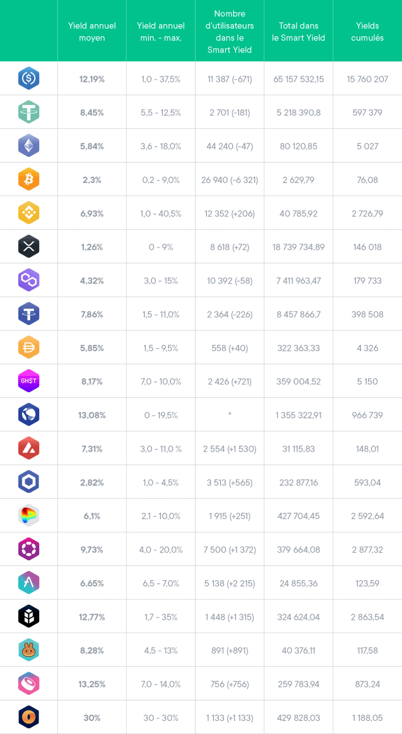 Dans un souci de transparence envers notre communauté, nous recueillons mensuellement nos données pour vous donner un rapport sur les chiffres clés liés aux portefeuilles Smart Yield de SwissBorg.