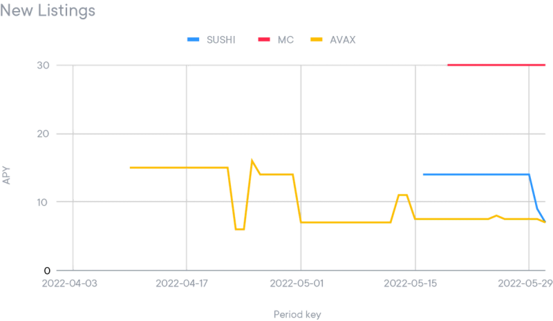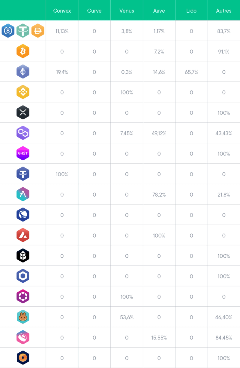 Nous vous rappelons que la sélection de protocoles est effectuée en gardant à l’esprit une stratégie de mitigation des risques. Cela peut avoir des conséquences sur l’APY final. De plus, l’optimiseur ne garde l’exposition que pour l’actif concerné par la stratégie et ne répartit jamais celle-ci sur différents actifs (par exemple en échangeant le USDC pour le DAI). Le protocole Anchor, qui soutenait le Yield élevé sur l'UST, était utilisé au début du mois de mai, mais a été interrompu après la situation catastrophique de la blockchain Terra. Pour cette raison, tous les UST ont été retirées d'Anchor, même si le protocole lui-même n'a jamais présenté de risque pour le cryptoactif sous-jacent.